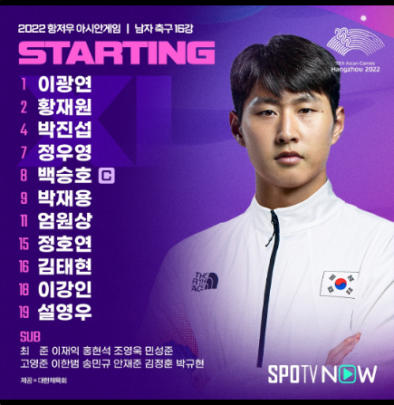 남자축구 16강전 라인업 한국대표팀은 박재용(전북 현대)을 원톱으로 하는 4-2-3-1 포메이션으로 출전했습니다. 공격형 미드필더는 정우영(슈투트가르트), 이강인(파리 생제르맹), 엄원상(울산 현대), 중원은 백승호(전북)와 정호연(광주FC)이 나섰습니다.