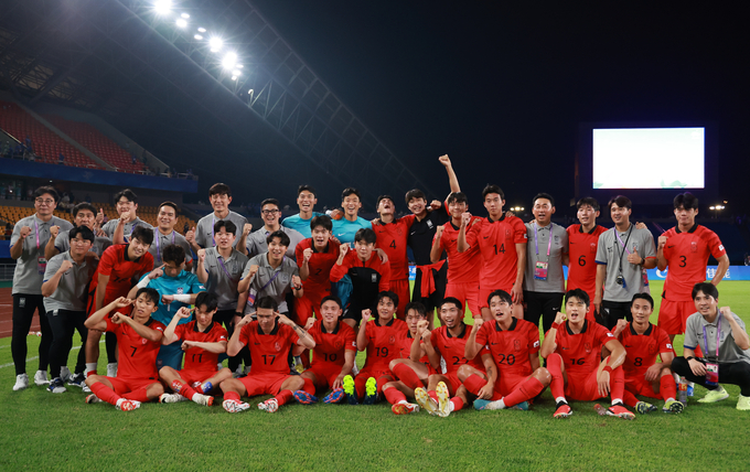 27일 열린 키르기스스탄과의 경기에서 8강행을 확정지은 한국남자 축구대표팀(사진출처:연합뉴스) <항저우 아시안게임> 남자 축구 대표팀 중계