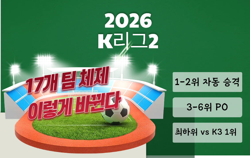 2026 시즌 K리그2가 완전히 바뀝니다. 17개 팀 체제, 승격·강등 구조, 플레이오프 방식과 K3 승강제까지 정확하게 정리했습니다.